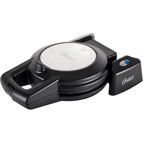 Máquina de Waffle Oster Perform 180 com alça isotérmica, acabamento em aço inox e chapa 100% antiaderente. Permite girar a massa 180° para um preparo uniforme.Porta-fio