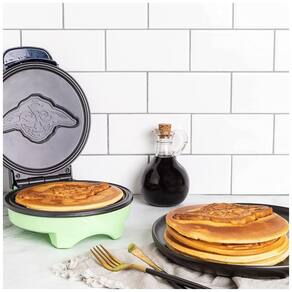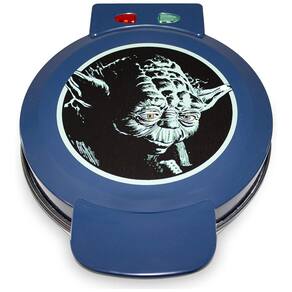 Máquina de Waffle Star Wars Yoda com placas antiaderentes, faz 2 waffles de tamanhos diferentes (cabeça do Yoda e redondo de 18cm), termostato regulado e luzes indicadoras.
