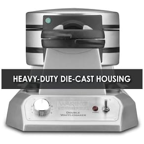 Máquina de Waffle Waring WW200, com capacidade para preparar dois waffles simultaneamente. Possui placas antiaderentes removíveis, controle de temperatura, indicadores LED e design vertical para economizar espaço.Porta-fio