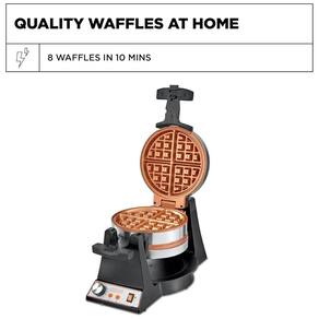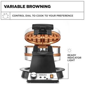 Máquina de waffles belga giratória dupla Crux 14614, com caixa de aço inoxidável, placas antiaderentes de cobre, controle de escurecimento, copo medidor e bandeja de gotejamento removível.Porta-fio
