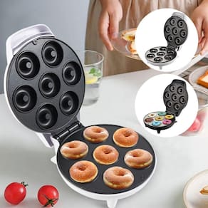Máquina de donuts e rosquinhas com aquecimento de dupla face para cozimento uniforme. Possui 7 furos para assar vários donuts simultaneamente. Superfície antiaderente para facilitar a limpeza.Luz indicadora de funcionamento
