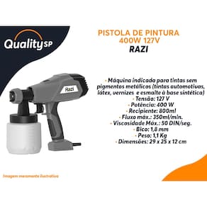 Características: • Tensão: 127 V (voltagem de operação). • Potência: 400 W (watts). • Capacidade do recipiente: 800 ml (capacidade de tinta). • Fluxo máximo: 350 ml/min (quantidade de tinta que pode ser aplicada por minuto). • Viscosidade máxima: 50 DIN/seg (indica a espessura máxima da tinta que a pistola pode aplicar). • Bico: 1,8 mm (diâmetro da ponta de aplicação da tinta). • Peso: 1,1 kg (peso da pistola). • Dimensões: 29 x 25 x 12 cm (tamanho físico do aparelho).