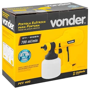 Características: Marca: Vonder Modelo: PEV400 Tipo: Elétrica Capacidade do reservatório: 800ml Material da máquina: Plástico Material da caneca: Plástico Material da agulha: Plástico Diâmetro: 2,6 mm Vazão de tinta: 700 ml/minuto Comprimento do cordão elétrico: 2,00 m Tipo de jato de tinta: vertical, horizontal e circular Frequência: 50 Hz / 60 Hz Indicado para: Tintas Chave de ajuste do volume de tinta: Sim Sistema HVLP (alto volume e baixa pressão): Sim