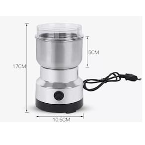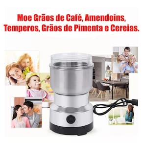 Contém - 01 aparelho moedor com lâmina e recipiente em inox. - voltagem 127v - largura 10,5cm altura 17cm80cm de cabo - adequado para moer grãos de café, amendoins, temperos, grãos de pimenta e cereias. moedor de café