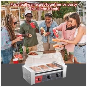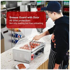 Possui 7 rolos antiaderentes de aço inoxidável 304, capazes de suportar até 18 cachorros quentes e girar 360 graus para cozinhar todos os itens uniformemente. É perfeita para preparar salsichas, cachorros quentes grossos, salsichas rechonchudas ou até mesmo cachorros quentes congelados de forma rápida e eficiente. Com controles duplos de temperatura apoiados por 830 W de potência de aquecimento, é possível ter controle independente sobre os rolos frontais e traseiros para que você possa preparar dois tipos diferentes de alimentos ao mesmo tempo ou usar as zonas separadas para cozinhar e manter simultaneamente seus alimentos mais populares. O protetor transparente contra espirros com porta garante que não haja contaminação indesejada no ar, protegendo o mínimo exposto ao ar e o máximo contra contaminação. A limpeza de final de dia é simples graças a uma bandeja coletora removível que coleta o excesso de sucos e óleos, além dos rolos que só precisam ser enxugados com água morna e sabão e um pano limpo e macio. A proteção pode ser retirada para limpeza completa com as mãos desprotegidas, sem necessidade de montagem. Esta churrasqueira é uma adição valiosa para barracas de concessão, lanchonetes e lojas de conveniência, pois vem com todos os recursos necessários para torná la uma adição valiosa ao seu estabelecimento.
