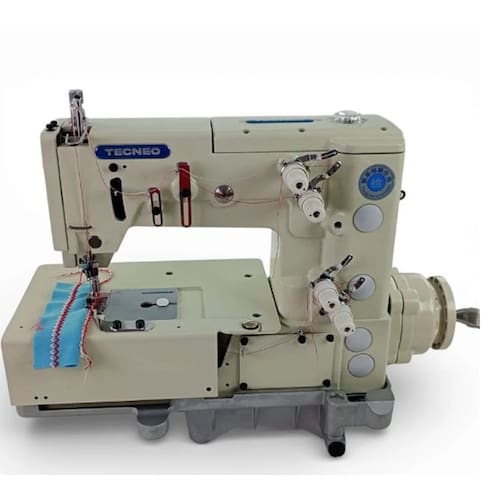 Máquina de costura industrial base plana, ponto decorativo tipo picueta para borda de roupas femininas e infantis. Possui 2 agulhas, 4 linhas e 4 tipos de pontos diferentes. Altura do calcador de 8mm e velocidade de 3500 PPM. Utiliza agulha UOx163 e motor Direct Drive.Funções