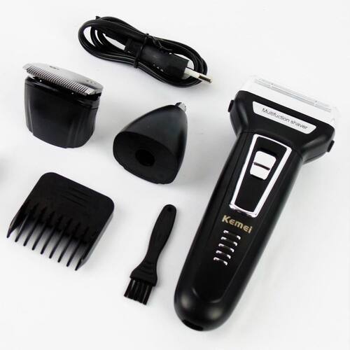1 máquina kemei 1 cabo de carregamento 1 oléo lubrificante 1 pincel de limpeza 1 cabeça para barbear 1 cabeça aparador de pelos de nariz 1 cabeça cortador de cabelo Marca: Não Informado