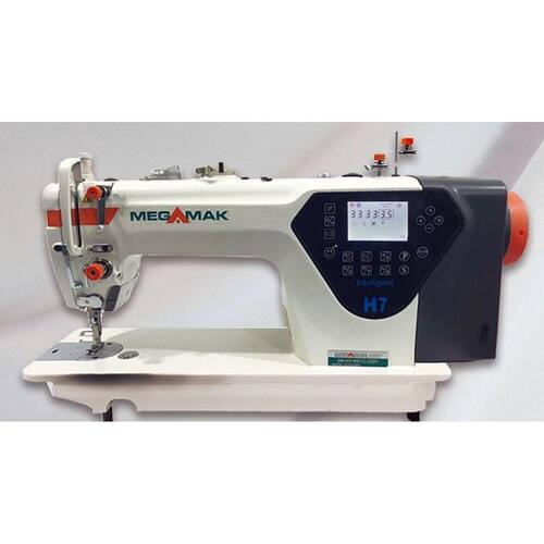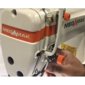Maquina de Costura Reta Eletrônica Megamak com motor Direct Drive, lubrificação automática e lançadeira pequena.