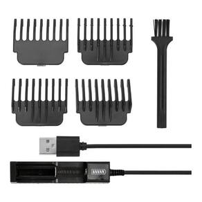 capacidade da bateria: 1200mah tempo de carregamento: 3 horas tempo de uso: 120 horas tensão do produto: 110v-240v 50hz-60hz potência: 5w acompanha bateria de ions lítio recarregável de 18500 lâmina de titânio e carbono acompanha 4 pentes: 1mm, 2mm, 3mm e 4mm