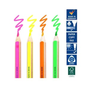 - Lápis marca-texto seco com cera translúcida triangular ergonômico jumbo; - Sem trespassar através de papel fino, por ex. jornais, passagens da bíblia; - INK°JET SAFE – não mancha as impressões a jato de tinta; - 4 cores neon; - Madeira de florestas geridas de forma sustentável certificadas pelo FSC.