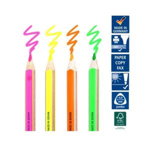 - Lápis marca-texto seco com cera translúcida triangular ergonômico jumbo; - Sem trespassar através de papel fino, por ex. jornais, passagens da bíblia; - INK°JET SAFE – não mancha as impressões a jato de tinta; - 4 cores neon; - Madeira de florestas geridas de forma sustentável certificadas pelo FSC.