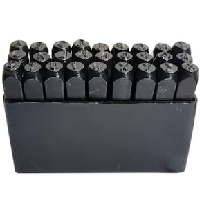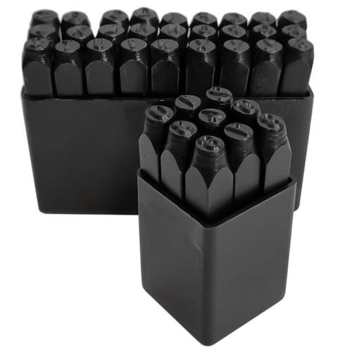 Kit de marcar com 36 peças sendo 26 Letras de A a Z letras maiúsculas , & caractere especial e 9 números 0 a 9 . Indicado para marcação e gravação manual de informações em aço, alumínio, cobre, couro e etc.