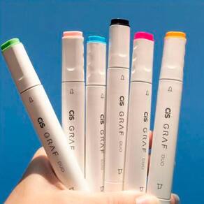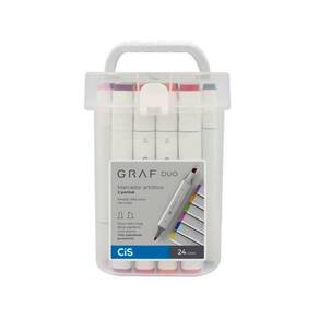 CIS GRAF DUO é um marcador com 2 pontas, sendo uma média e uma larga chanfrada. Possui a tinta pigmentada à base de álcool, com secagem rápida, não tóxica e permanente. Cores vibrantes que irão alegrar a vida dos fãs de papelaria, escolar, lettering, ilustrações, design de moda e arquitetura.Permite sobreposição de cores com excelente opacidade. É aconselhável que o marcador seja utilizado em papéis com gramaturas acima de 180 grs.Possui um design ergonômico.É uma ótima escolha para quem procura qualidade e versatilidade. O estojo contém 24 cores: Old Red, Deep Red, Vermilion, Geranium, Pastel Pink, Marigold, Pastel Peach, Melon Yellow, Pastel Yellow, Olive Green, Bronze Green, Vivid Green, Yellow Green, Turquoise Green, Pale Green, Baby Blue, Cobalt Blue, Light Violet, Burnt Sienna, Warm Grey, Black, Green Grey, Cool Grey e Blue Grey.Obs.: Possui em média 1 dia de resistência caso a caneta fique destampada.*Tampe após o uso e mantenha o marcador na posição horizontal para prolongar sua vida útil.Precauções: Evitar temperaturas acima de 45º bem como a exposição direta aos raios solares.