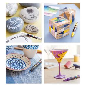 - Os marcadores de tinta à base de água de várias superfícies funcionam em madeira, vidro, metal, plástico, tecido e muito mais
