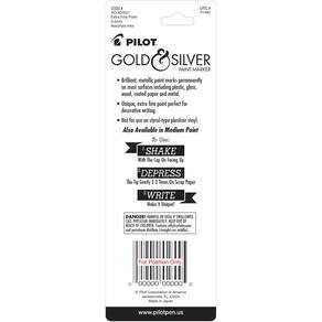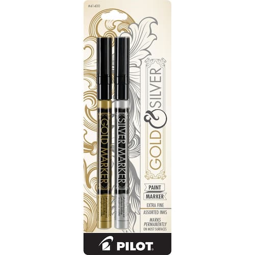 Pilot Marcadores de tinta permanente metálicos, 1 de ouro e prata, ponta extrafina, conjunto de 2 (41400) - A tinta decorativa brilhante marca permanentemente na maioria das superfícies, incluindo plástico, vidro, madeira, papel revestido e metal - Identifique itens como ferramentas, equipamentos esportivos e eletrônicos - Fica ótimo em fundos escuros. Ideal para artesanato. - Qualidade confiável: fabricamos canetas há mais de 100 anos. Se você estiver tomando notas, estocando material escolar ou de escritório, ou escrevendo em um diário, a Pilot tem a caneta perfeita para você! - Energia para a caneta: a Pilot faz instrumentos de escrita excepcionais para atender a todas as suas necessidades. Temos canetas-fonte, esferográficas, retráteis, apagáveis e de gel, marcadores de quadro branco e muito mais para todos os estilos de escrita.