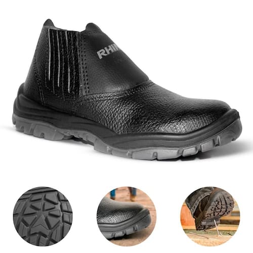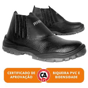 Calçado de segurança tipo Bota, cabedal em couro, constituído de gáspea em couro, traseira em couro e inserto em couro, colarinho forrado e estofado. Com fechamento através de elástico e palmilha de montagem fixada pelo sistema strobel.