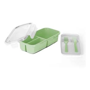 - Capacidade: 1,2 Litros - Acompanha: Garfo e Faca Polipropileno - 3 Divisórias - Material: Polipropileno e Silicone - Possui Travas Laterais