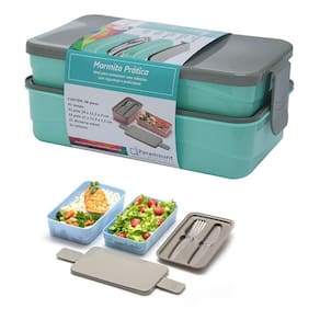 Marmita Pratica Dupla G com Colher E Acessórios Marmita grande, ideal para armazenar suas refeições com segurança e praticidade. Podemos garantir: - Fechamento Seguro - Alça de Fixação - Talher Reutilizável - Potes Empilháveis - Divisória Móvel - Super Prática Contém 5 peças: - 1 tampa - 1 pote 20 x 11,5 x 4 cm - 1 pote 21 x 12,5 x 5,5 cm - 1 divisória móvel - 2 talheres Dimensões: 23 x 13 x 9 cm Ean: 7898943565532