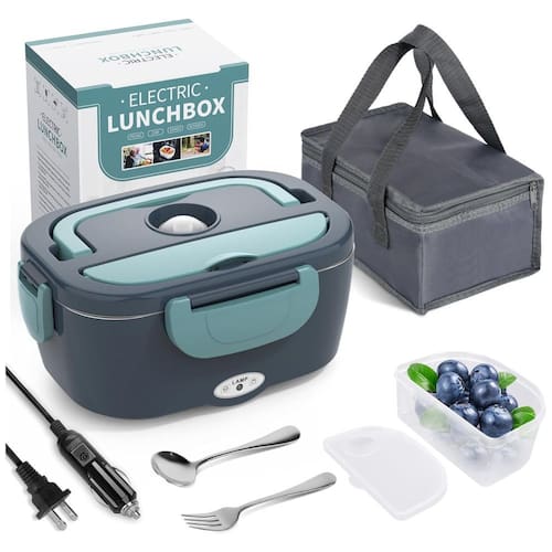 LISTA DE PACOTES Aquecedor de lancheira elétrico inclui 1 lancheira elétrica 17 10,8 , 1 saco de lancheira isolado, 1 compartimento adicional de plástico, 1 anel de vedação à prova de vazamentos, 1 colher e garfo de aço inoxidável, 1x aço inoxidável 304 caixa interna de aço, 1 pano de prato, 1 cabo de alimentação 12V para carros , caminhões, 1x 110V para uso doméstico , escritório. Capacidade 1.5L.