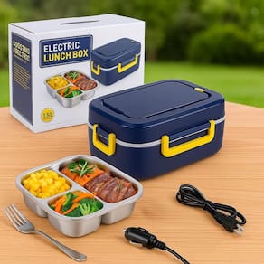 Marmita elétrica com aquecedor de alimentos em aço inoxidável. Possui 3 compartimentos para separar alimentos. Pode ser ligada na tomada (bivolt) ou em carregador veicular (12V). Design portátil com alça resistente ao calor. Ideal para casa, escritório, camping, etc.Lâmpada piloto