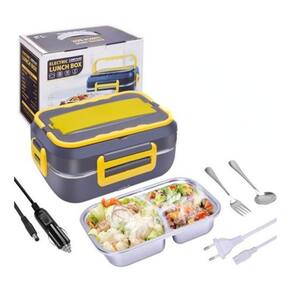 A Marmita Elétrica Interior Alumínio 110V / 12V Carro E Tomada acompanha os seguintes itens: 01 lunch box com 3 repartições, 01 talher em inox, 01 cabo tomada 110V e 01 cabo 12V para uso no carro.