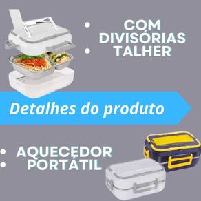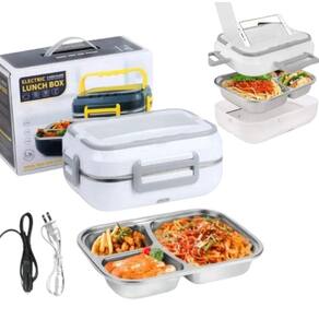 Marmita elétrica portátil com capacidade de 1.5L, ideal para aquecer alimentos em veículos (12V) e em casa (110V/220V). Possui travas laterais para fechamento seguro, repartições internas, suporte para talheres e é feita de plástico PP de grau alimentício e aço inoxidável 304.Lâmpada piloto