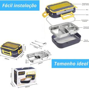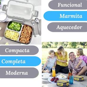 Trava nas laterais para que a tampa fique bem fixa e fechada Repartições para separação de alimentos Suporte talher Voltagem: 110v e 12v carro Material: plástico pp de grau alimentício e aço inoxidável 304 Capacidade: 1,5l Peso: 920 gramas Dimensões: 22cm x 17cm x 11cm Cor: branco / azul escuro