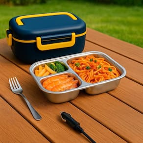 Marmita elétrica de inox com saída veicular/tomada. Mantém o sabor dos alimentos sem uso de água. Função bivolt. Design de 3 compartimentos para separar alimentos. Alça resistente ao calor. Portátil para casa, escritório, camping, etc. Carregamento por tomada ou USB.Lâmpada piloto