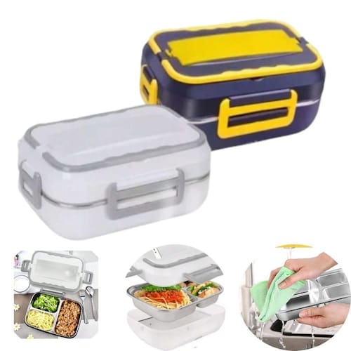 Trava nas laterais para que a tampa fique bem fixa e fechada, Repartições para separação de alimentos, Suporte talherLâmpada piloto