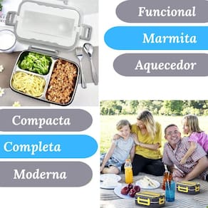 Trava nas laterais para que a tampa fique bem fixa e fechada, Repartições para separação de alimentos, Suporte talher, Material: plástico pp de grau alimentício e aço inoxidável 304, Dimensões: 22cm x 17cm x 11cmLâmpada piloto