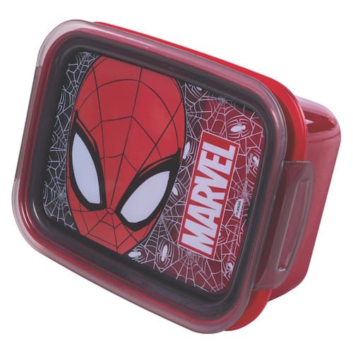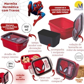 Pote Marmita com fechamento Hermético por vedação de borracha, com Trava Dupla, retangular, colorido e com tampa incolor com decoração permanente. Tem capacidade para 850ml. Conta ainda com 1 compartimento removível para melhor acomodação e separação dos alimentos. Conta com decoração de um dos personagens mais queridos das crianças, o Homem Aranha. O produto é fabricado pela Plasútil e é oficialmente licenciado pela marca.