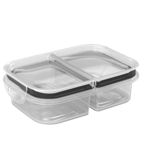 Para uma melhor higienização, o pote é composto exatamente por 2 peças, à saber: 1 recipiente principal incolor retangular com duas divisórias e 1 tampa incolor com borda de borracha preta e trava dupla.
