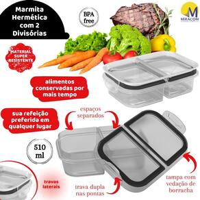 Pote Marmita 2 Divisórias com fechamento Hermético por vedação de borracha, com Trava Dupla, retangular e totalmente incolor. Tem capacidade total para 510ml. Tanto o pote principal quanto a tampa são 100% transparente, para melhor identificação dos alimentos. Conta com uma tira de borracha na tampa, que auxilia na conservação do conteúdo interno por mais tempo. O produto é produzido pela Plasútil e todos os seus componentes são fabricados em polipropileno de alta densidade, atóxicos, totalmente seguros para a saúde/alimentação e livres de bisfenol-A em sua composição (BPA Free).