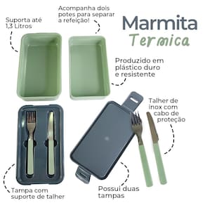 - Fechamento Seguro com Trava - Talheres Inox - Pote Empilhável, melhor organização - Divisória móvel - Livre de BPA (BPA Free) - Capacidade total: 1,3 litros. - Pode usar em micro-ondas, mas ATENÇÃO, Para uso em micro-ondas remover os talheres.