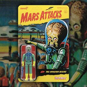 De Super7. A Mars Attacks está se juntando à linha de figuras retrô da ReAction. Baseado nos Ataques a Marte de Tim Burton, essas figuras ReAction têm 3,75 polegadas de altura e apresentam cinco pontos de articulação, além de serem embaladas em cartões de apoio retrô legais!