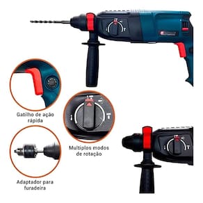 Martelete 1200w perfurador/rompedor 110v Furadeira martelo rompedor profissional com maleta para transporte. - . Segue abaixo configuração. - encaixe mandril - função martelete impacto, com ou sem rotação - função furadeira rotação sem impacto - limitador de profundidade - encaixe para acessórios de - talhadeira / ponteira e kit brocas Informações técnicas - rotação: 1300rpm - potência: 1200watts - voltagem: 220v ou 110v - função martelete: 5100rpm - tamanho do mandril: 24mm - botão de seleção para rotação, rotação com impacto e impacto - frequência: 50/60hz - sistema reversível - modelo: nk-2603pro - marca: nakasaki Diferenciais do produto: Alça e cabo auxiliar emborrachados oferecendo maior conforto e firmeza ao operador. Medidor de profundidade Motor com dupla isolação Indicação: Indicada para uso em metal, madeira, alvenaria e concreto. Comprimento - 42,5cm Largura - 11,5cm Altura - 27,5cm Peso - 2,6kg Acompanha brocas sds Marca: Não Informado