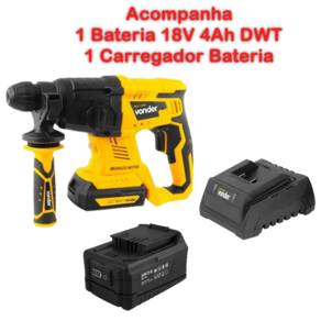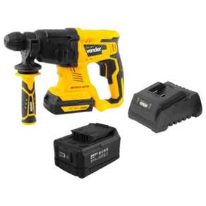 Este equipamento utiliza um modelo de bateria que pode ser intercambiável, ou seja, uma bateria que é compatível com outros modelos de ferramentas a bateria Vonder/DWT. Por isso, em sua próxima compra de ferramenta a bateria VONDER, procure um modelo que comece com a referência "I", ou que esteja identificado com o selo "Bateria Intercambiável VONDER". Desta forma, você garante modelos mais econômicos, sem a necessidade de aquisição de novas baterias e carregadores para uso em seu equipamento. Possui rotação com ou sem impacto e função rompedor, adequando-se a diferentes necessidades de uso. Seu sistema de encaixe tipo SDS PLUS facilita a troca rápida do acessório. Conta também com cabo tipo "D" com revestimento emborrachado, punho auxiliar com sistema de ajuste rápido do limitador de profundidade, conferindo praticidade e conforto ao operador, e motor Brushless (sem escova de carvão), garantindo maior durabilidade, resistência e desempenho.