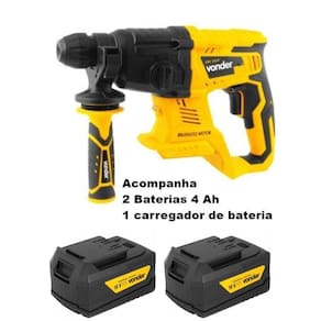 Este equipamento utiliza um modelo de bateria que pode ser intercambiável não acompanha , ou seja, uma bateria que é compatível com outros modelos de ferramentas a bateria VONDER. Por isso, em sua próxima compra de ferramenta a bateria VONDER, procure um modelo que comece com a referência I, ou que esteja identificado com o selo Bateria Intercambiável VONDER. Desta forma, você garante modelos mais econômicos, sem a necessidade de aquisição de novas baterias e carregadores para uso em seu equipamento. Possui rotação com ou sem impacto e função rompedor, adequando-se a diferentes necessidades de uso. Seu sistema de encaixe tipo SDS PLUS facilita a troca rápida do acessório. Conta também com cabo tipo D com revestimento emborrachado, punho auxiliar com sistema de ajuste rápido do limitador de profundidade, conferindo praticidade e conforto ao operador, e motor Brushless sem escova de carvão , garantindo maior durabilidade, resistência e desempenho.