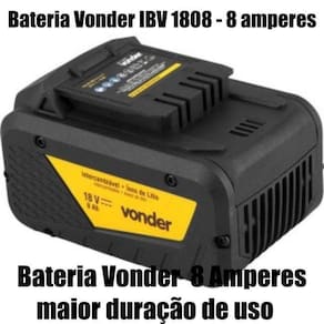 A bateria de íons de lítio de 8 Amperes proporciona alta eficiência de operação. Possui indicador de nível de carga com três LEDs vermelhos, que indicam o status de carga da bateria. A base emborrachada da bateria ajuda a prevenir riscos em superfícies e absorver impactos leves.