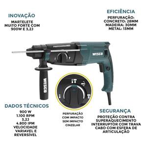 Martelete romp perfurador wesco 900w 3,2j ws3228k + mandril Voltagem: 220v Martelete rompedor perfurador modelo ws3228k com 900w de potência Com maleta, ponteiro, talhadeira, brocas, adaptador e mandril Martelete perfurador/rompedor - 28 mm - 900 w Excelente performance e custo-benefício Dados técnicos 4 funções: perfurar com e sem impacto, rompimento e giro de 360 da talhadeira; Velocidade variável e reversível; Proteção contra superaquecimento; Cabo com de articulação para maior durabilidade; com trava de segurança. Potência nominal: 900 w; Rotação: 0-1.100 rpm; Energia de impacto: 3,2 j; Impactos por minuto: 0-4.800 ipm; Encaixe: sds-plus; Peso: 3,2 kg; Capacidade máxima de perfuração: Perfuração concreto: 28 mm; Perfuração madeira: 30 mm; Perfuração metal: 13mm. Itens que acompanham a máquina: -01 empunhadura auxiliar; -01 limitador de profundidade; -03 brocas de 6/8/10 x 150 mm; -01 ponteiro; -01 talhadeira; -01 maleta plástica; -01 adaptador de mandril; -01 mandril 1/2. Marca: Não Informado
