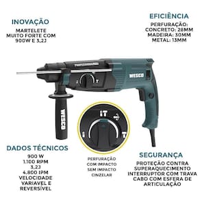Martelete rompedor perfurador modelo ws3228k com 900w de potência Com maleta, ponteiro, talhadeira, brocas, adaptador e mandril Martelete perfurador/rompedor - 28 mm - 900 w Excelente performance e custo-benefício Dados técnicos 4 funções: perfurar com e sem impacto, rompimento e giro de 360 da talhadeira; Velocidade variável e reversível; Proteção contra superaquecimento; Cabo com de articulação para maior durabilidade; com trava de segurança. Potência nominal: 900 w; Rotação: 0-1.100 rpm; Energia de impacto: 3,2 j; Impactos por minuto: 0-4.800 ipm; Encaixe: sds-plus; Peso: 3,2 kg; Capacidade máxima de perfuração: Perfuração concreto: 28 mm; Perfuração madeira: 30 mm; Perfuração metal: 13mm. Itens que acompanham a máquina: -01 empunhadura auxiliar; -01 limitador de profundidade; -03 brocas de 6/8/10 x 150 mm; -01 ponteiro; -01 talhadeira; -01 maleta plástica; -01 adaptador de mandril; -01 mandril 1/2. Marca: Não Informado Ean: 7909463124106