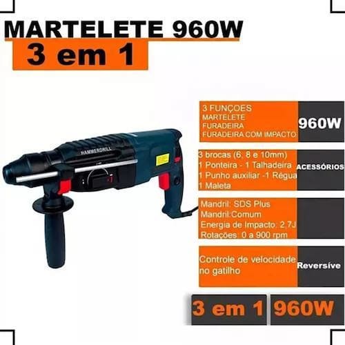 - Marca: Nakasaki - Modelo: NK260 - Potência: 960w - Mandril: SDS Plus - Energia de Impacto: 2,7 J - Nº máximo de impactos: 0 - 5.100 ipm - Velocidade variável - Rotações: 0 a 900 rpm - Controle de velocidade no gatilho - Reversível - Mandril: 26mm - Empunhadura emborrachada proporciona conforto ao operador - Velocidade variável e reversível