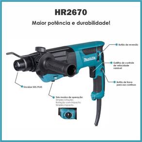 Martelete rompedor sds plus hr2670 makita 800w e 3 joules Voltagem: 110v Martelo combinado perfurador e rompedor makita, modelo hr2670, com 800w de potência e 3,0 joules Este é o novo martelete rompedor da makita, o hr2670, com 800w e 3,0j. É ideal para trabalhos mais exigentes, com maior potência e durabilidade. O modelo hr2670 é compatível com brocas sds plus. Devido ao redesenho da sua estrutura interna, a makita conseguiu atribuir maior potência e durabilidade. Ele é equipado com três modos de operação: somente perfuração, perfuração com impacto e somente impacto. Diferenciais do hr2670 Maior potência e durabilidade; Energia de impacto de 3j; Maior eficiência em perfuração comparado ao modelo anterior; Botão de bloqueio embutido para uso contínuo; Dupla isolação; Velocidade variável e reversível; Capacidade: Diâmetro máximo de perfuração em concreto com broca tct : 26 mm; Diâmetro máximo de perfuração em concreto com coroa : 68 mm; Diâmetro máximo de perfuração em concreto com coroa diamantada : 80 mm; Faixa de diâmetro ideal de perfuração em concreto: 4 - 18 mm; Diâmetro máximo de perfuração em madeira: 32 milímetros; Diâmetro máximo de perfuração em aço: 13 milímetros; Dados técnicos: Potência de entrada contínua: 800 w; Velocidade sem carga: 0 - 1500 min; Impactos por minuto ipm : 0 - 4500 min; Energia de impacto: 3,0 j; Adaptado para bits sds-plus; Cabo de alimentação: 4,0 m; Nível de potência sonora: 102 db a ; Nível sonora: 94 db a ; Peso: 2,9 kg; Dimensões do produto c x l x a : 362 x 77 x 207 mm; Potência máxima de saída: 550 w; Nível de vibração, perfuração com martelo em concreto: 16,1 m/s; Incerteza de vibração fator k , perfuração de martelo em concreto: 1,5 m/s; Nível de vibração, cinzelamento: 14,2 m/s; Incerteza de vibração fator k , cinzelamento: 1,5 m/s Itens que acompanham a máquina: -01 empunhadura lateral; -01 limitador de profundidade; -01 maleta; Marca: Não Informado