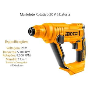Características:A INGCO produz ferramentas de alta qualidade para uso profissional e industrial, está presente em mais de 180 países e agora também no BrasilFerramenta com luz de LED, facilitando a visibilidade em lugares mais escuros.Possui função reversa em apenas 1 botão.Especificações:Voltagem: 20 V.Rotações: 0 - 900 RPM.Impactos: 0 - 5.100 IPM.Força de Impacto: 1.5 J.Número de Funções: 2.Capacidade do Mandril:- Em Aço: 10 mm.- Em Concreto: 16 mm.- Em Madeira: 20 mm.Lanterna Integrada: Sim.Função Martelete: Sim.Conteúdo:1 Martelete Rotativo Ingco 20 V; 3 Brocas SDS-Plus e Manual.