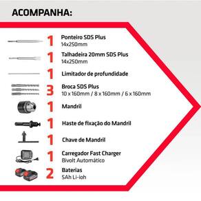 Martelete Rotativo Perfurador Rompedor Industrial 3j - Super Tork MPR-1020-3.0J-2X5AH Você precisa de um martelo rotativo perfurador e rompedor industrial confiável e potente para seus trabalhos O Martelete Rotativo Perfurador Rompedor Industrial 3J da Super Tork é a escolha perfeita - Características: Energia de impacto: 3 Joules Velocidade sem carga: 0-950 RPM Tipo de impacto: axial Sistema de controle de velocidade Rotação reversível Absorção de vibração Capacidade máxima de perfuração metal: 26mm Capacidade máxima de perfuração madeira: 30mm Capacidade máxima de perfuração alvenaria: 26mm Velocidade variável no gatilho Freio instantâneo Eficiência energética Empunhadura com soft grip Especificações Técnicas: Tensão do carregador: 127V/220V Tensão da bateria: DC-20V Energia de impacto: 3 Joules RPM: 0-950 IPM: 0-4700 Encaixe: SDS plus Dimensões: 340x82x220mm Peso: 7,235 kg - Itens Inclusos: Carregador FAST CHARGER Duas Bateria 20V de 5Ah Mandril com adaptador SDS plus Broca SDS plus 10 x 160mm Broca SDS plus 8 x 160mm Broca SDS plus 6 x 160mm Ponteiro SDS plus 14 x 250mm Talhadeira 20mm SDS plus 14 x 250mm Limitador de profundidade - : 3 anos de de fábrica. Marca: Super Tork Modelo: MPR-1020-3.0J-2X5AH Código de Barra: 7898533565942 Imagens meramente ilustrativas, podendo sofrer pequenas alterações. Todas as informações divulgadas são de responsabilidade do Fabricante/Fornecedor Marca: Não Informado Ean: 7898533565942