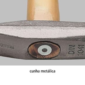 A cabeça do martelo é fixada ao cabo por meio de uma cunha metálica, garantindo uma conexão segura e minimizando o risco de acidentes durante o uso.