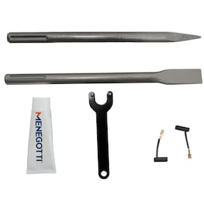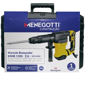 Produto: Martelo Rompedor 1300W 15 joules 6 kg Sds Max com acessórios- MMR1300 Marca: Menegotti Voltagem: 220VDescrição: O Martelo Rompedor 1.300 watts 15 joules 6 kg Sds Max com acessórios MMR1300 da Menegotti é uma ferramenta versátil para demolições em concreto, pisos, alvenaria, revestimentos, dentre outros.  O MMR1300 possui sistema de encaixe tipo SDS MAX, este equipamento permite uma troca rápida do acessório, proporcionando eficiência e agilidade no trabalho. Com peso de 6 kg, e sua alça auxiliar proporciona melhor firmeza na operação e a trava no gatilho permite trabalhar de forma contínua. Tem o cabo com revestimento emborrachado e um motor com dupla isolação, garantindo maior segurança durante o uso. Além disso, o Martelo Rompedor MMR1300 é acompanhado por 1 ponteira, 1 talhadeira, 1 chave dois pinos, 2 escovas de carvão, 1 bisnaga de lubrificante e 1 maleta. Indicado para e industrial, este equipamento oferece desempenho confiável e durabilidade em diversas aplicações. Características: • Sistema SDS Max: Oferece encaixe seguro e rápido para uma ampla variedade de acessórios, como picas, ponteiras e brocas. • Energia de impacto de 15 Joules: Proporciona força máxima para romper e demolir com rapidez e eficiência. • Motor de 1.300 Watts: Garante alta potência para enfrentar os materiais mais resistentes, como concreto, tijolos e pedras.Especificações: Frequência: 60HzPotência: 1300WMotor: Monofásico Impacto por minuto: 4100 IpmForça de impacto: 15JEncaixe da Ponteira: SDS MAX. itens Inclusos: 1 ponteira, 1 talhadeira, 1 chave dois pinos, 2 escovas de carvão, 1 bisnaga de lubrificante,1 maleta.