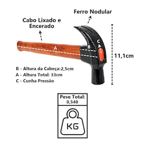 Martelo Unha Cabo de Madeira Envernizado Cunha Pressão 25mm