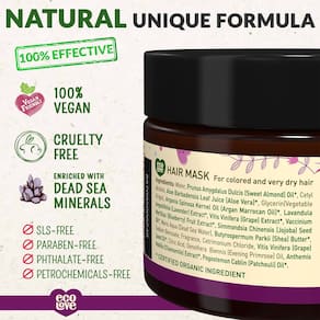 - Ingredientes naturais e orgânicos: a máscara capilar de condicionamento profundo ecoLove Purple Collection é livre de SLS, parabenos e petroquímicos. 95% ingredientes derivados da natureza (30% orgânico). Enriquecido com óleos essenciais, ervas orgânicas e extratos de plantas e 26 minerais do Mar Morto.