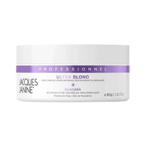 Máscara matizadora para cabelos loiros e com luzes. Jacques Janine Ultra Blond neutraliza o amarelado e resgata a maciez e o brilho.